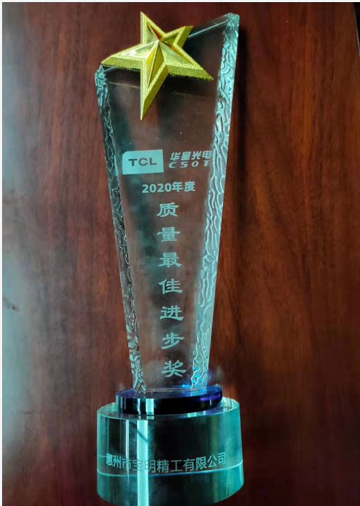 2021年3月10日在华星光电2020年优秀供应商表彰活动中,九游电子·(中国)官方网站荣获 “质量最佳进步奖”。并获颁奖杯。